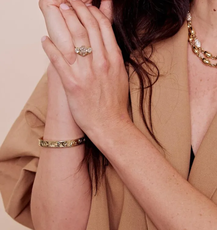 Handcrafted, hand-engraved 18K yellow gold bangle with snap closure.