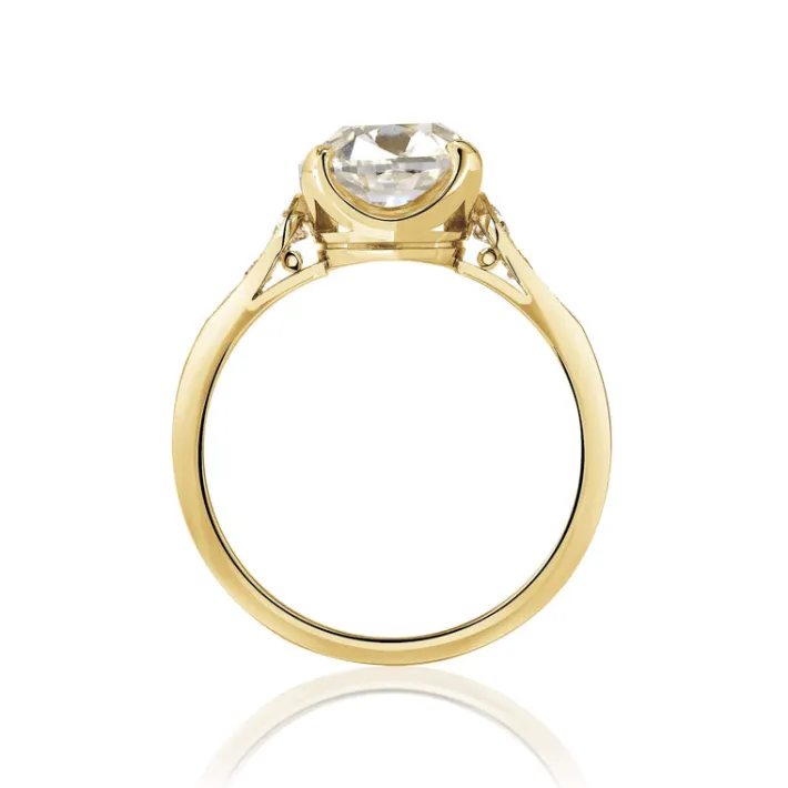 3.35ct N/SI1 GIA certified antique cushion cut diamond with 0.16ctw old European cut accent diamonds prong set in a handcrafted 18K yellow gold mounting.