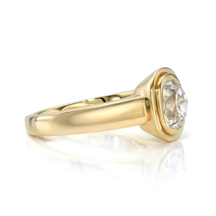 1.74ct L/SI1 GIA certified antique cushion cut diamond bezel set in a handcrafted 18K yellow gold mounting.