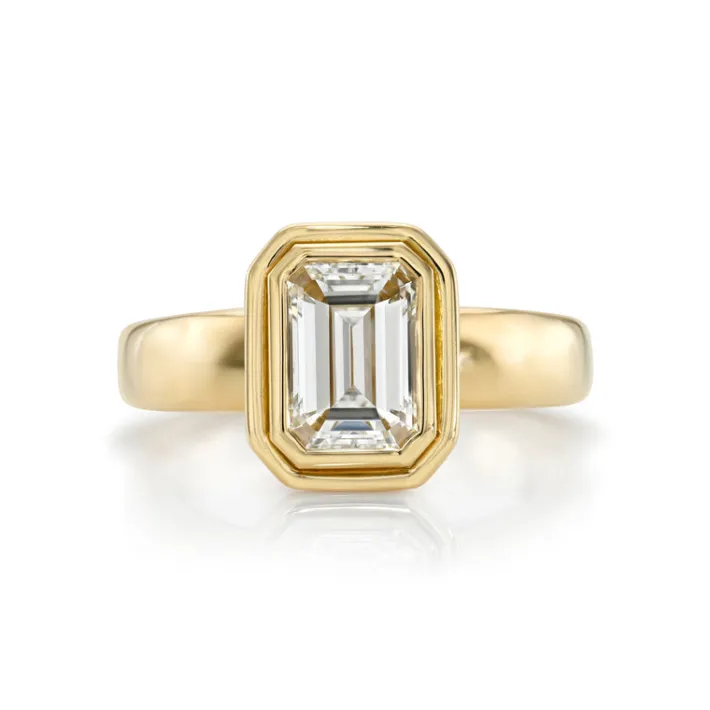 1.51ct L/VVS2 GIA certified emerald cut diamond bezel set in a handcrafted 18K yellow gold mounting.