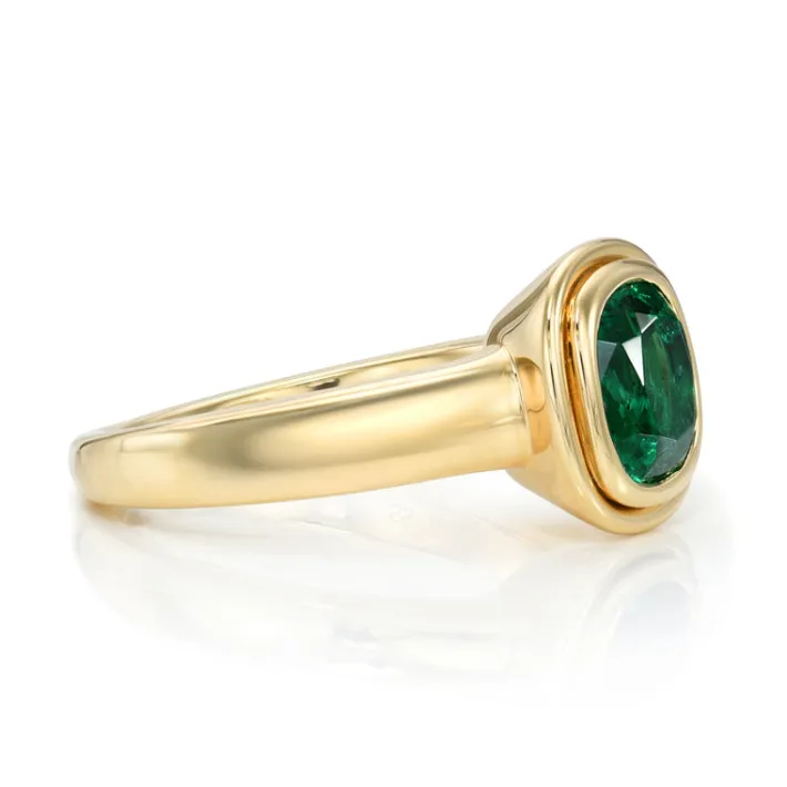 1.64ct GIA certified Zambian antique cushion cut green emerald bezel set in a handcrafted 18K yellow gold mounting.