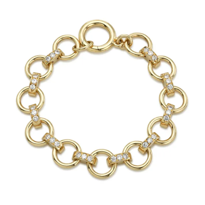 Handcrafted 18K yellow gold alternating round and domed link bracelet with pendant enhancer featuring approximately 1.75…