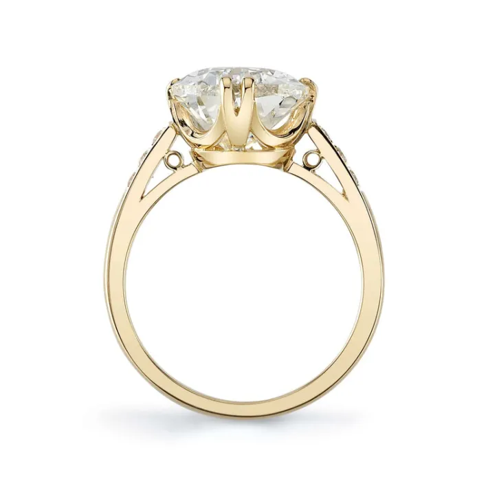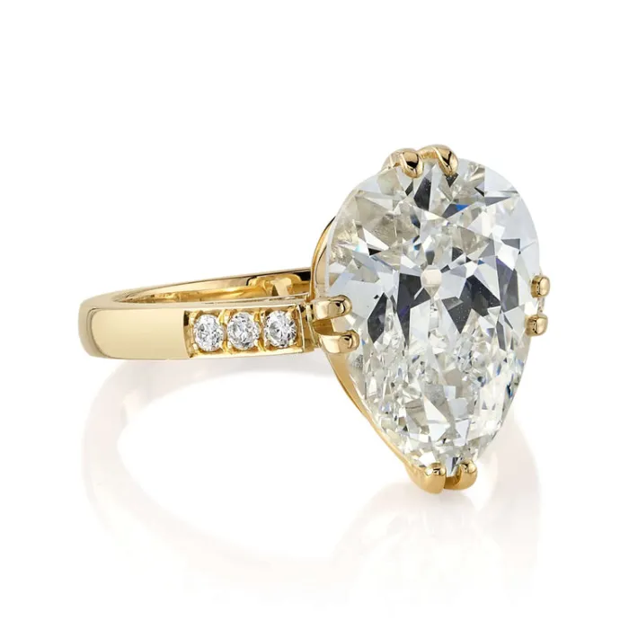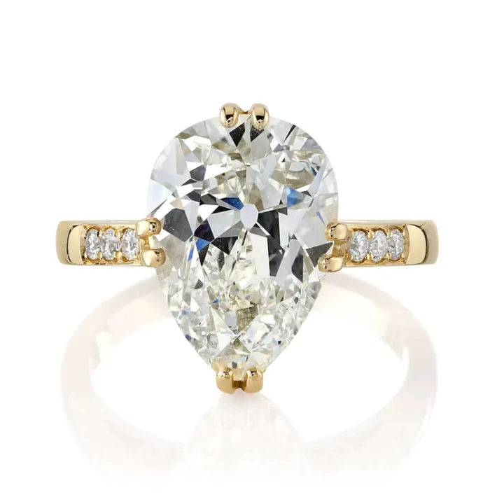 5.00ct L/VVS1 GIA certified antique pear shaped diamond with 0.11ctw old European cut accent diamonds set in a handcrafted 18K yellow gold mounting.