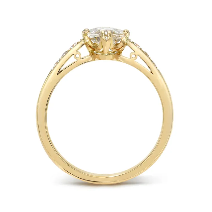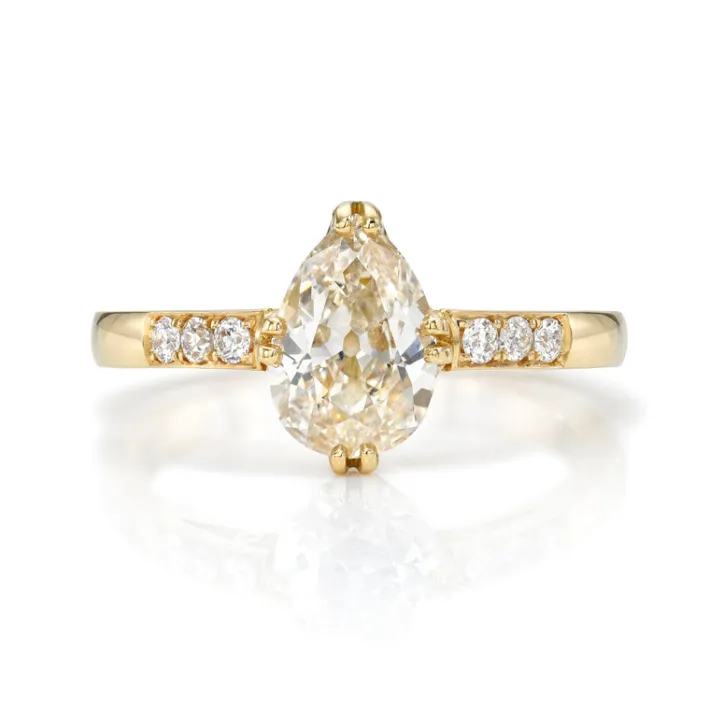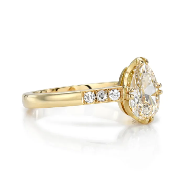 1.01ct L/VS2 GIA certified pear shaped diamond with 0.06ctw old European cut accent diamonds prong set in a handcrafted 18K yellow gold mounting.