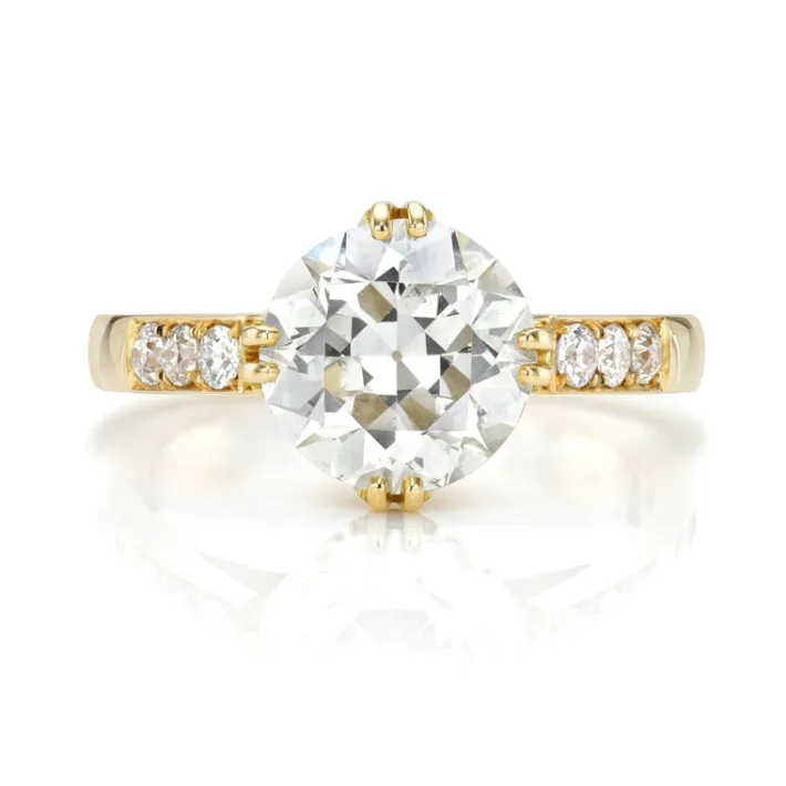 2.35ct K/VS2 GIA certified old European cut diamond with 0.18ctw old European cut accent diamonds prong set in a handcrafted 18K yellow gold mounting.