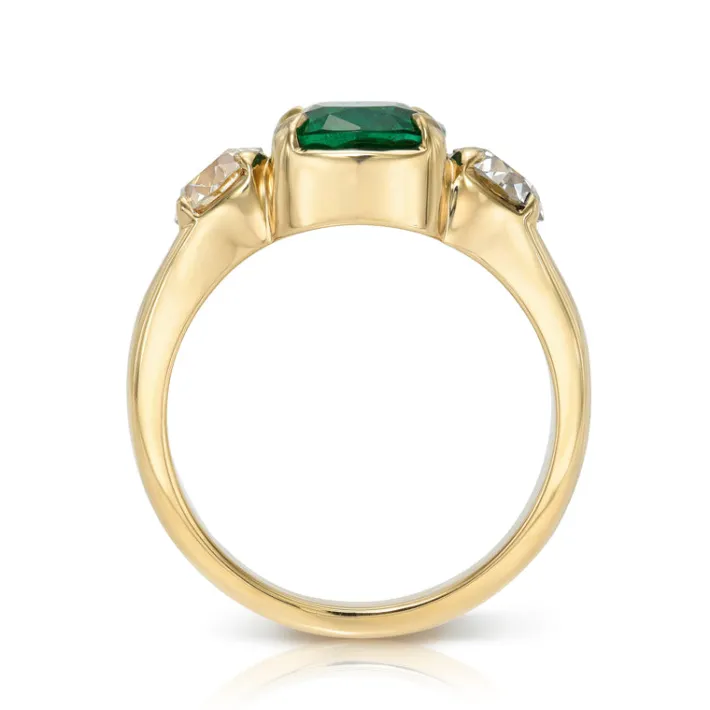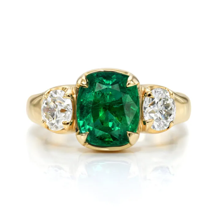 1.86ct GIA certified Zambian oval cut emerald with 0.80ctw H-I/VS old European cut accent diamonds prong set in a handcrafted 18K yellow gold mounting.