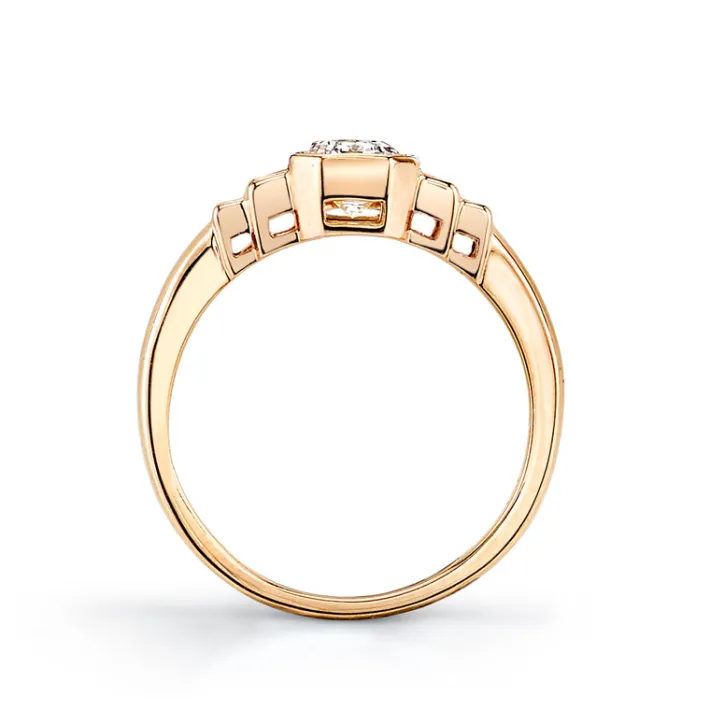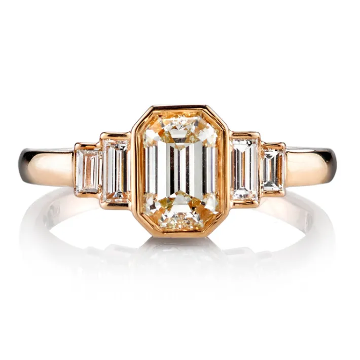 1.02ct L/VS2 GIA certified emerald cut diamond with 0.32ctw baguette cut accent diamonds bezel set in a handcrafted 18K rose gold mounting.