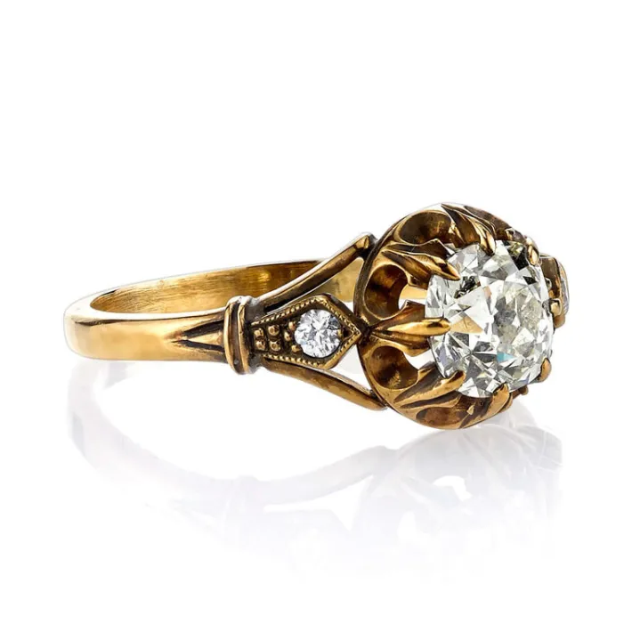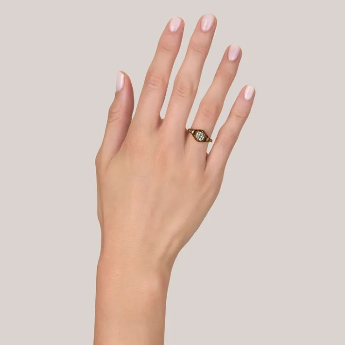 1.07ct L/SI1 EGL certified antique cushion cut diamond with 0.06ctw old European cut accent diamonds set in a handcrafted oxidized 18K yellow gold mounting.