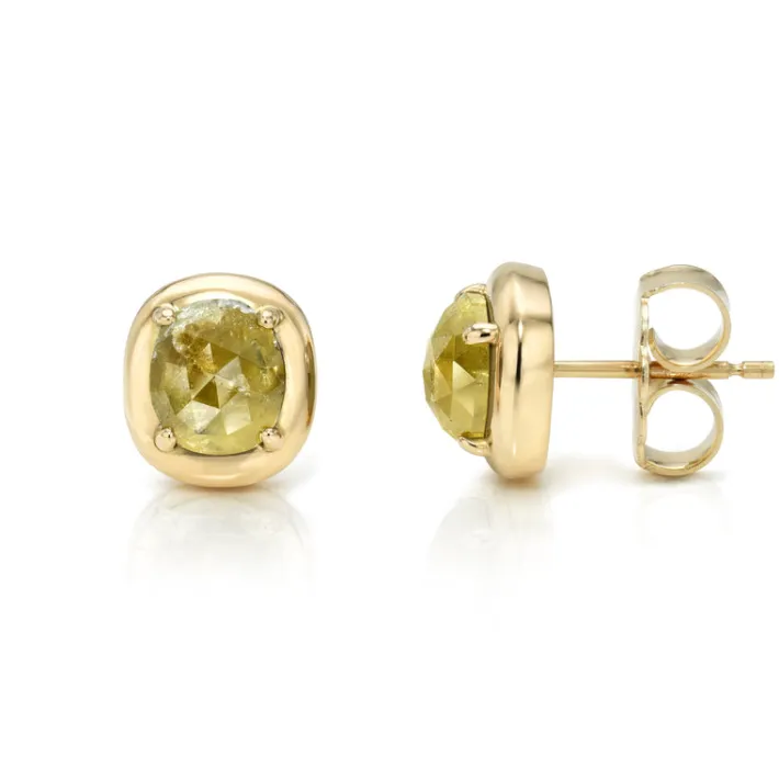 2.52ctw natural rustic cushion-shaped rose cut diamonds prong set in handcrafted 18K yellow gold stud earrings.