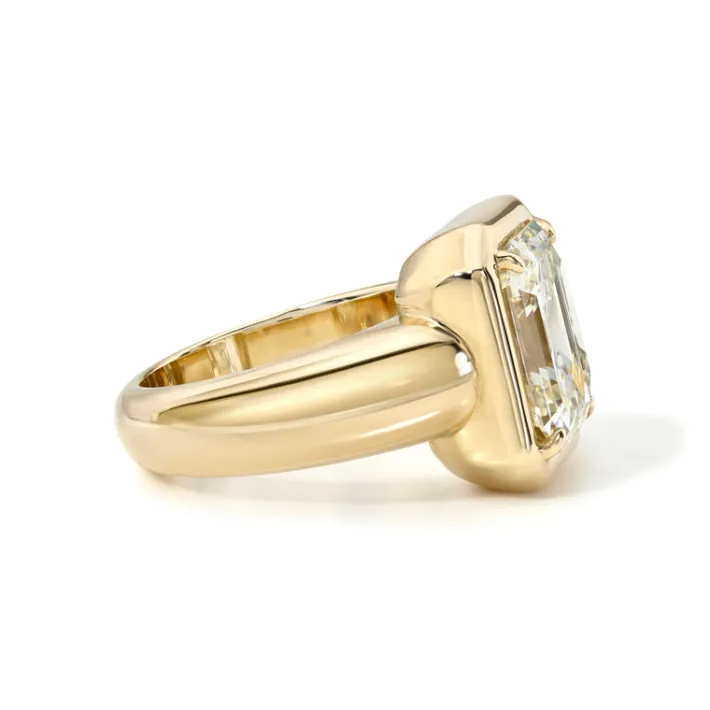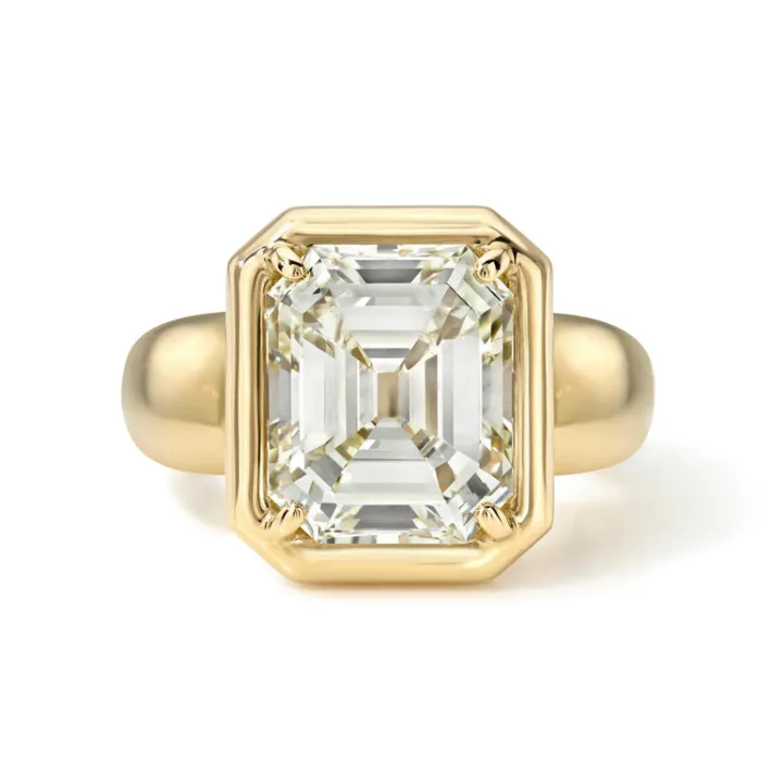 6.00ct N/VS1 GIA certified emerald cut diamond prong set in a handcrafted 18K yellow gold mounting.