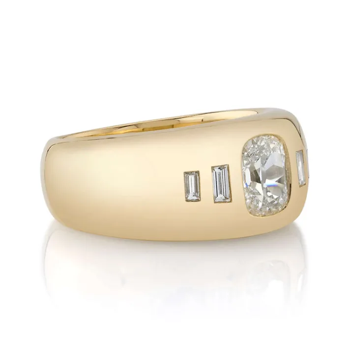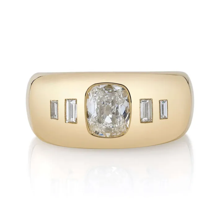 1.02ct I/VS1 GIA certified antique cushion cut diamond with 0.14ctw baguette cut accent diamonds set in a handcrafted 18K yellow gold mounting.