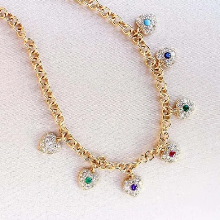 The seven heart charms are comprised of approximately 5.30ctw varying antique cut diamonds and approximately 1.50ctw of color center gemstones set in our cobblestone style on our 17″ handcrafted 18K yellow gold Mini Club necklace.