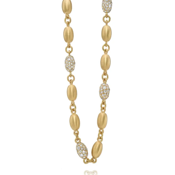 10.53ctw varying old cut and round brilliant cut diamonds cobblestone set in a handcrafted, satin finish 18K yellow gold large bead necklace.