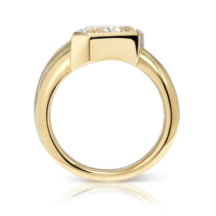 2.50ct F/SI1 GIA certified vintage Trapezoid cut diamond bezel set in a handcrafted 18K yellow gold mounting with a tapered shank.