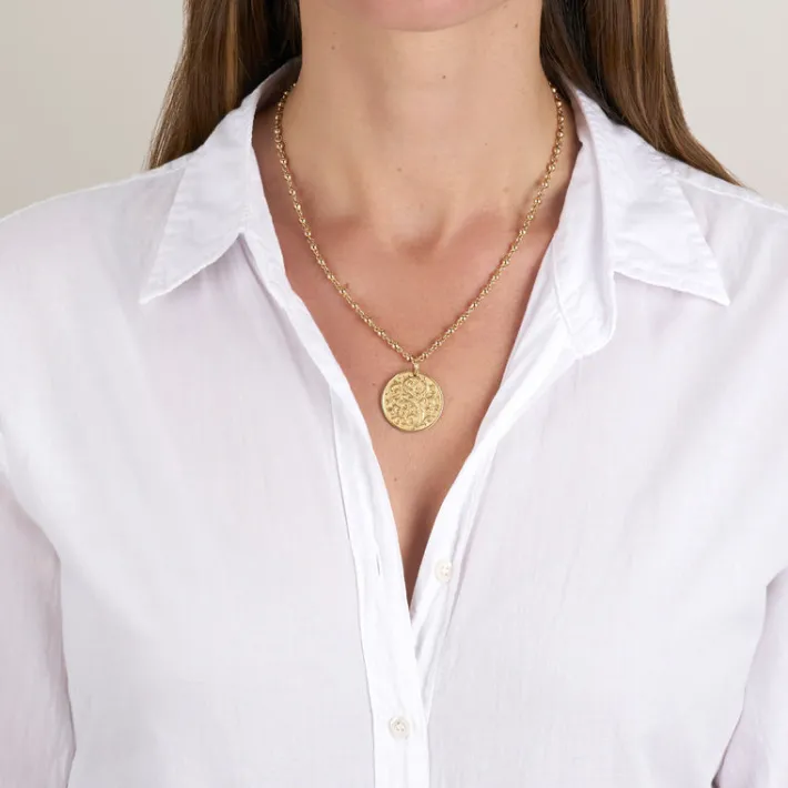 Handcrafted 18K yellow gold engravable round pendant with engraved floral design.