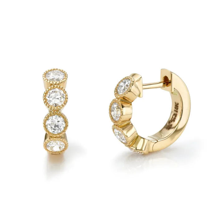 Approximately 0.65-0.70ctw old European cut diamonds bezel set in handcrafted huggie earrings.