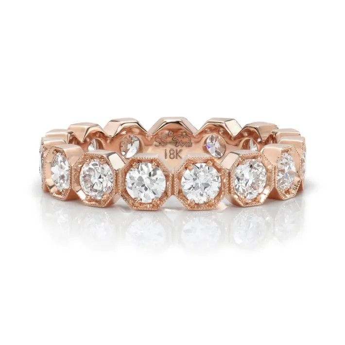 Approximately 1.80ctw G-H/VS-SI old European cut diamonds prong set in a handcrafted octagonal framed eternity band.