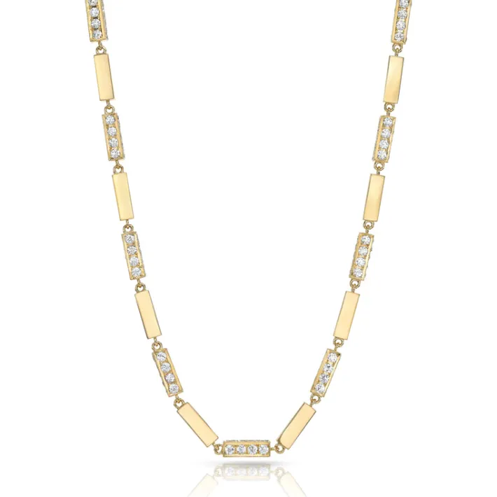 Approximately 9.00ctw G-H/VS old European cut diamonds pavé set in a handcrafted 18K yellow gold alternating diamond and full bar necklace.