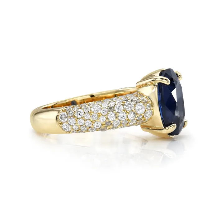 3.07ct GIA certified Sri Lankan oval cut blue sapphire with 0.84ctw old European cut accent diamonds prong set in a handcrafted 18K yellow gold mounting.