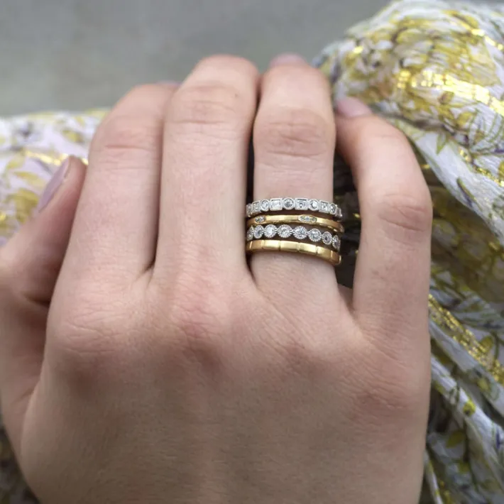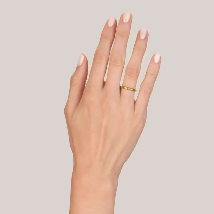 Approximately 0.15ctw G-H/VS old European cut diamonds set in a handcrafted, satin finish eternity band.
