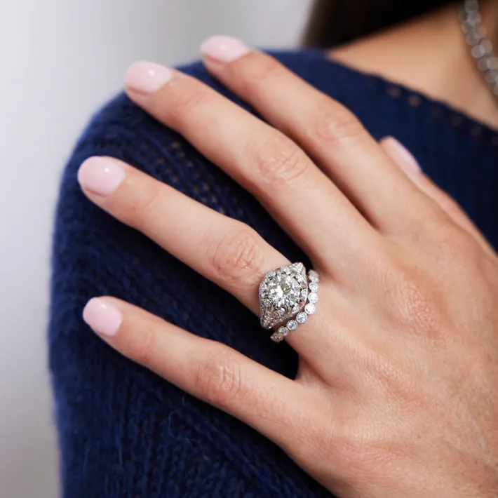2.29ct M/VS2 GIA certified old European cut diamond with 0.87ctw old European cut accent diamonds prong set in a handcrafted platinum mounting.