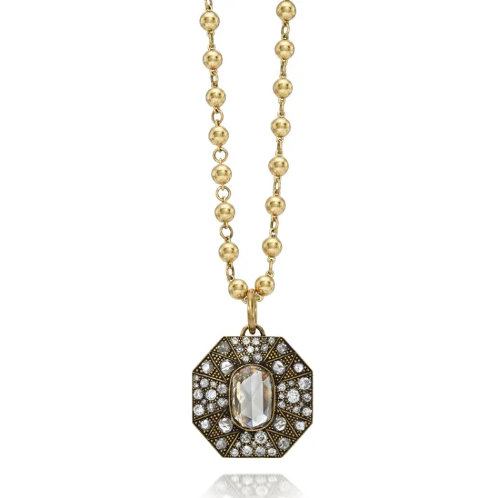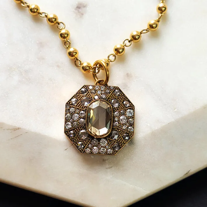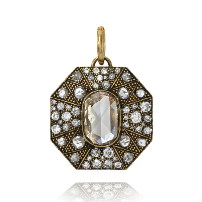 5.93ct GIA certified Fancy Brown-Yellow/I2 oval rose cut diamond with 3.23ctw varying old, rose and round brilliant cut diamonds set in a handcrafted, oxidized 18K yellow gold pendant.