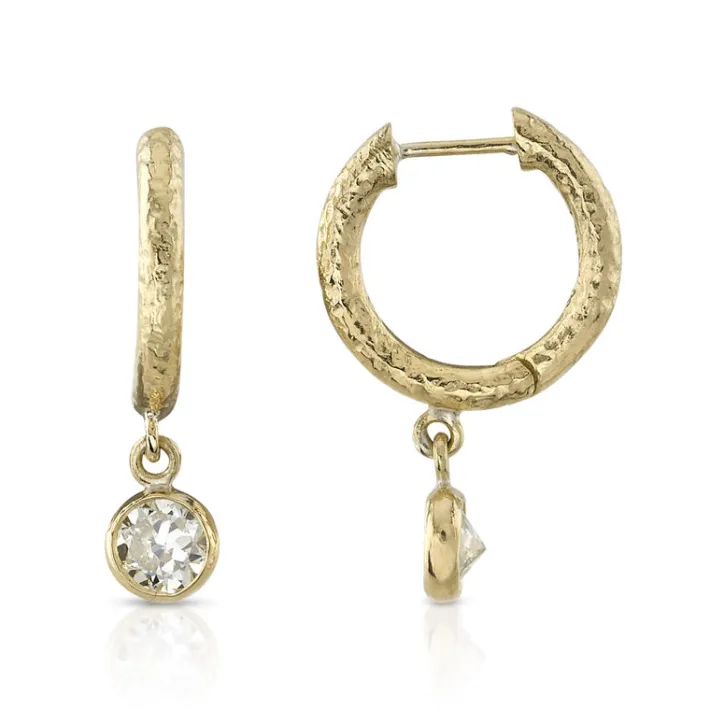 0.51ctw L-M/I1 old European cut diamonds drop set on handcrafted 18K yellow gold hammered finish huggie earrings.
