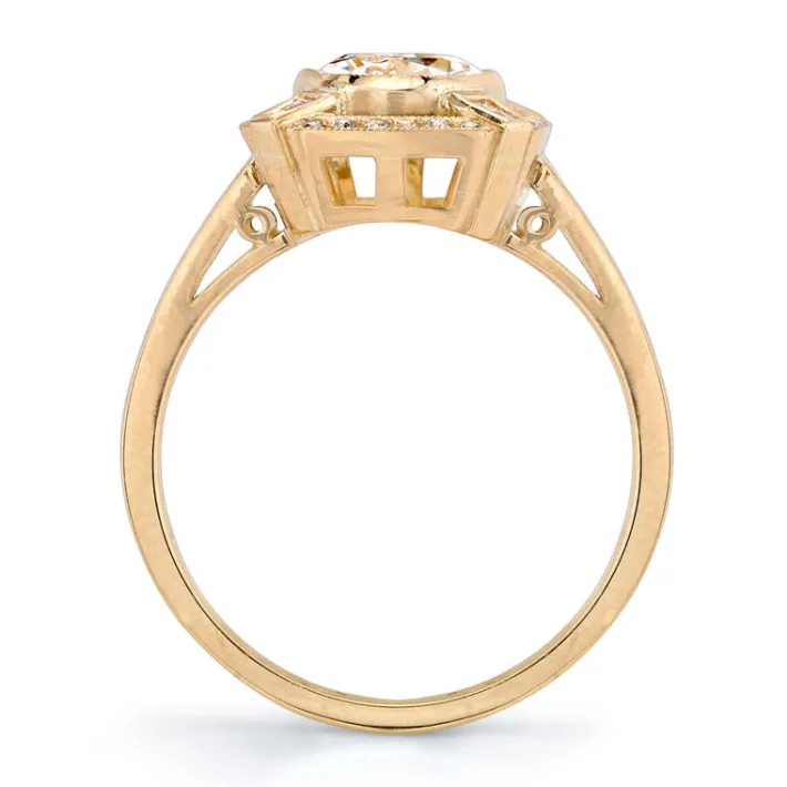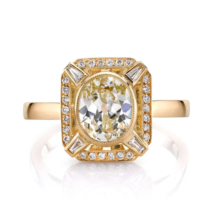 1.31ct L/VS1 EGL certified antique oval cut diamond bezel set with 0.10ctw old European cut accent diamonds and 0.06ctw tapered baguette cut accent diamonds set in a handcrafted 18K yellow gold mounting.