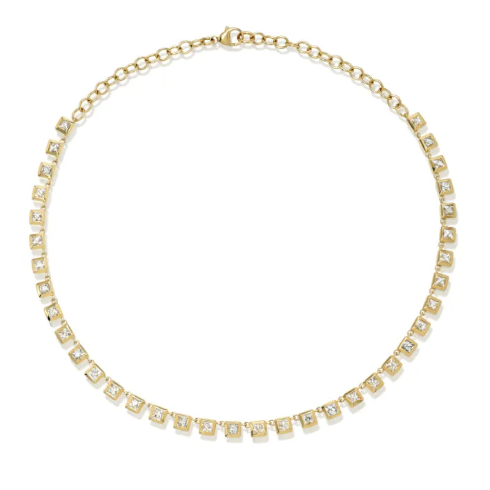 15.34ctw H-I/VS-SI square French cut diamonds bezel set in a handcrafted 18K yellow gold necklace.