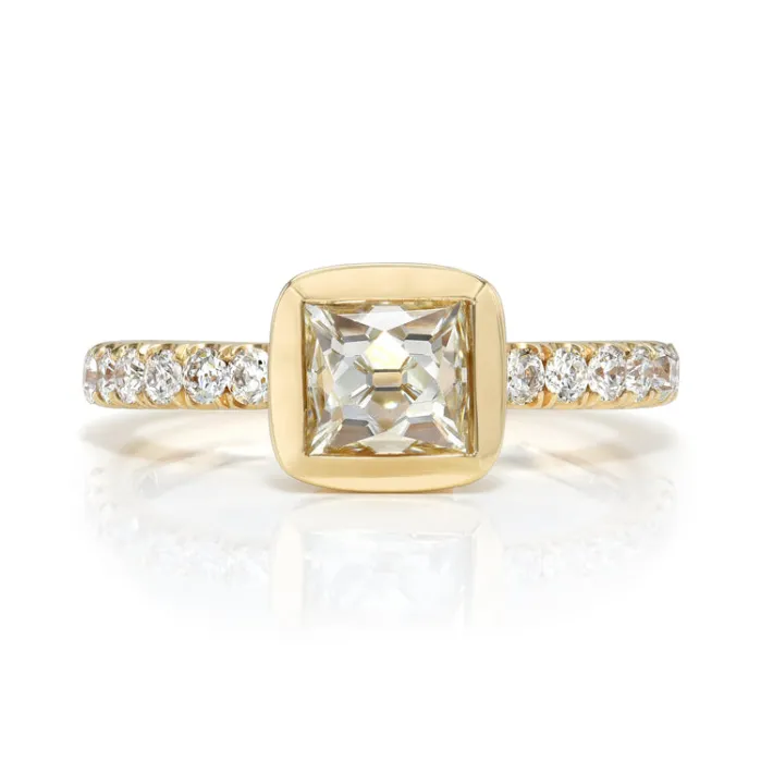 1.09ct J/VS1 GIA certified French cut diamond with 0.42ctw old European cut accent diamonds set in a handcrafted 18K yellow gold mounting.