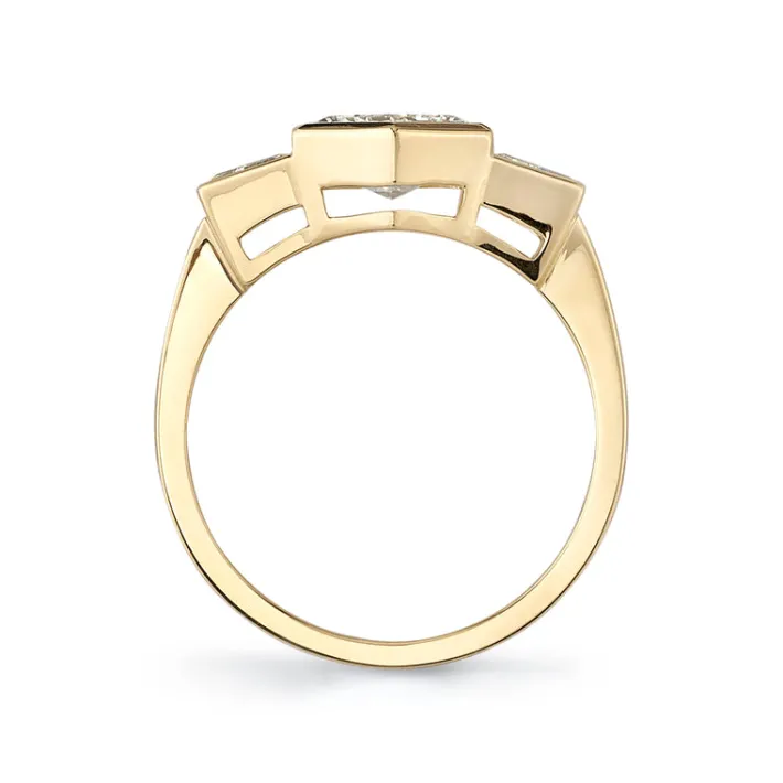 2.00ct M/VVS2 GIA certified hexagonal step cut diamond with 0.77ctw trapezoid cut accent diamonds bezel set in a handcrafted 18K yellow gold mounting.