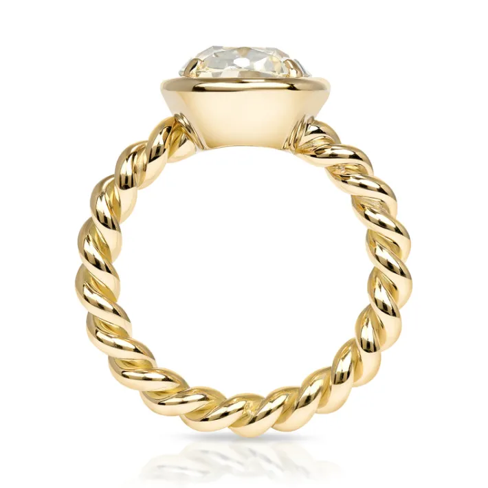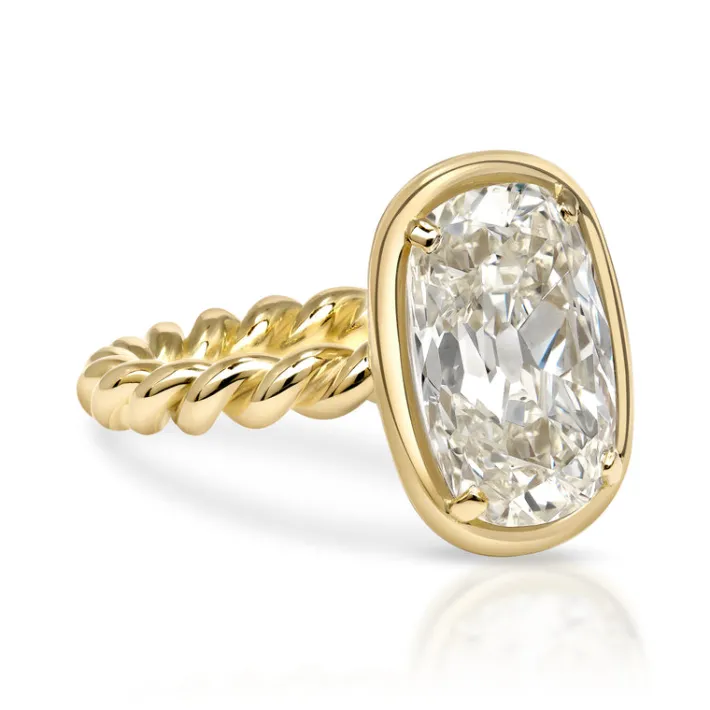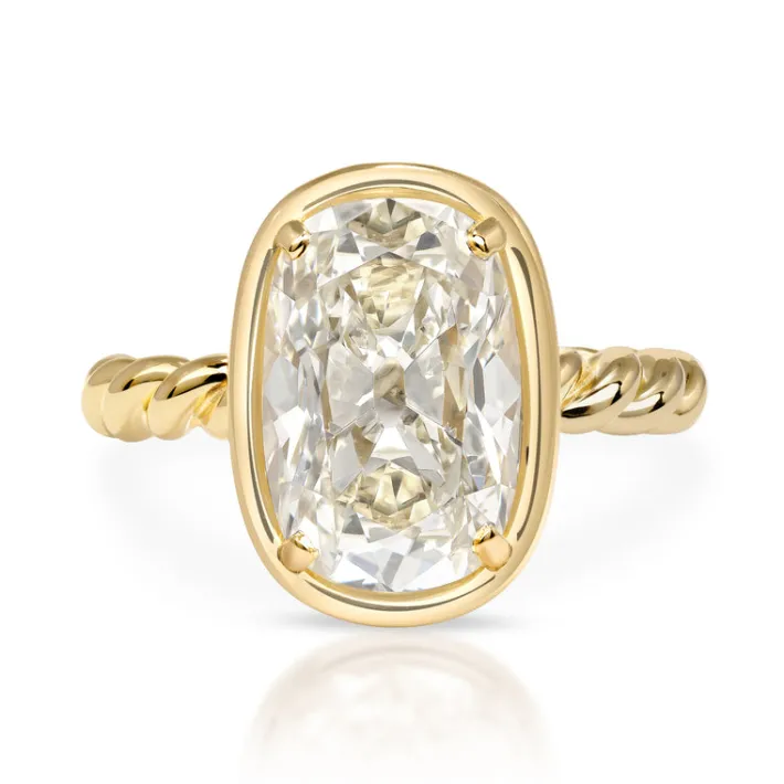 5.09ct S-T/VS1 GIA certified antique cushion cut diamond prong set in a handcrafted 18K yellow gold mounting.
