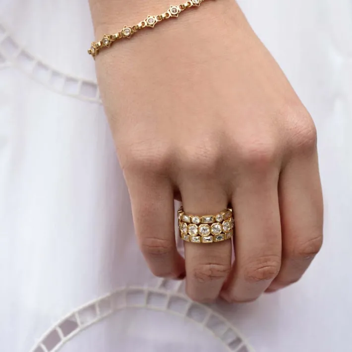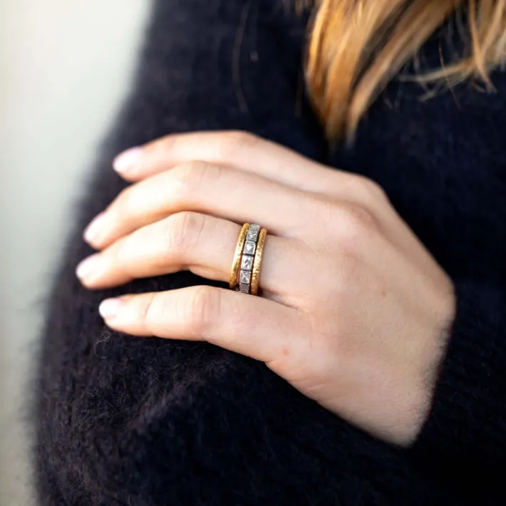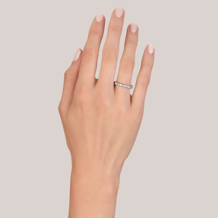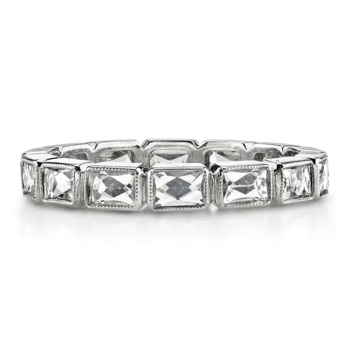 Approximately 1.30-1.60ctw G-H/VS French cut diamonds bezel set in a handcrafted eternity band.