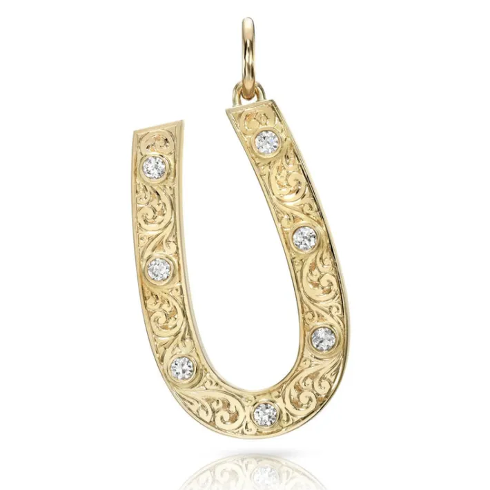 Approximately 0.70ctw G-H/VS old European cut diamonds bezel set in a handcrafted, hand engraved 18K yellow gold horseshoe pendant.