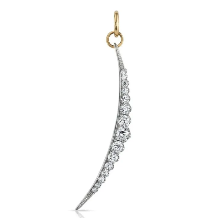 Approximately 1.60-1.80ctw G-H/VS-SI old European and antique old mine cut diamonds set in a handcrafted 18K yellow gold and platinum crescent moon charm.