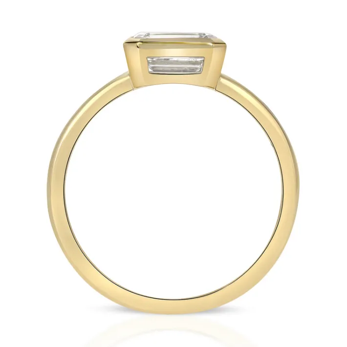 1.04ct K/VS2 GIA certified emerald cut diamond bezel set in a handcrafted 18K yellow gold mounting,
