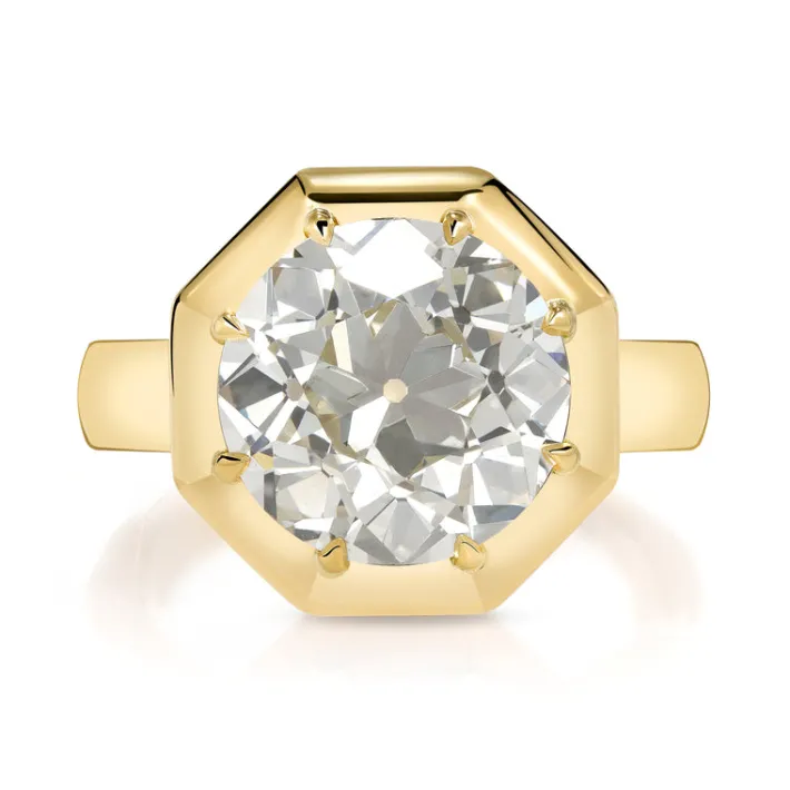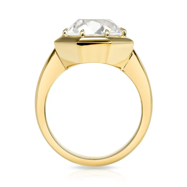 5.02ct M/VS1 GIA certified old European cut diamond prong set in a handcrafted 18K yellow gold mounting.