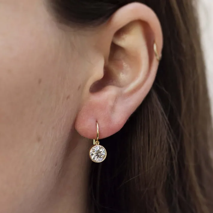 2.49ctw K/VSI-VS2 GIA certified old European cut diamonds bezel set in handcrafted 18K yellow gold drop earrings.