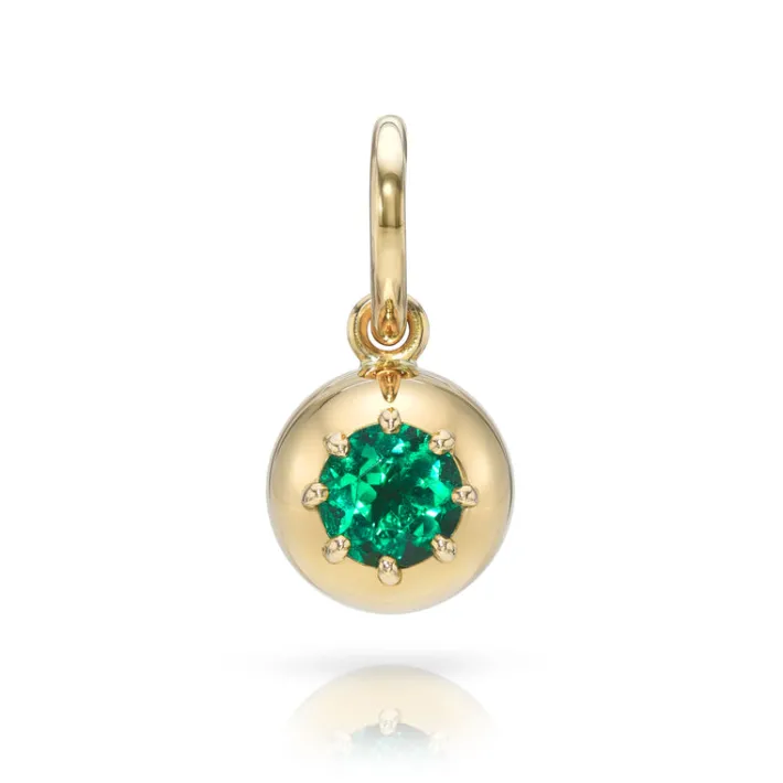 0.70ct round cut green emerald prong set in a handcrafted 18K yellow gold sphere shaped pendant.Price does not include n…