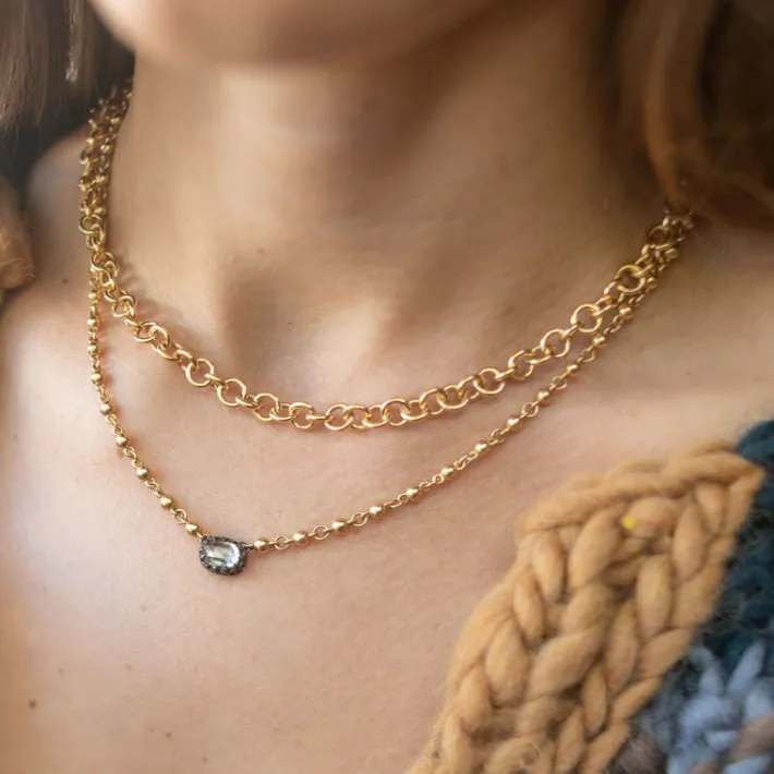 Handcrafted 18K yellow gold small club necklace. Available from 16″ up to 30″.Price does not include pendants.