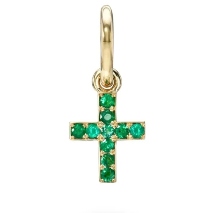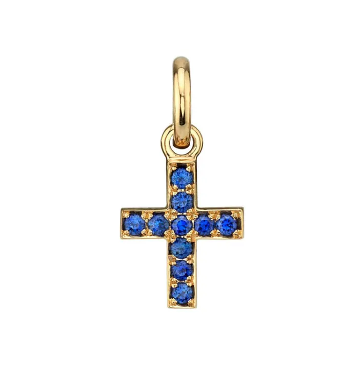 Approximately 0.15ctw round cut gemstones pavé set in a handcrafted 18K yellow gold cross. Cross measures 8.20mm x 9.80…