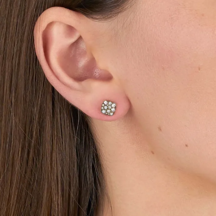 Approximately 0.60ctw varying old cut and round brilliant cut diamonds set in handcrafted 18K yellow gold stud earrings. Available in a polished or oxidized finish. Prices vary according to diamond weight.