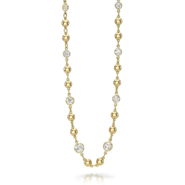 Approximately 4.00ctw old European cut and old mine cut diamonds set on our handcrafted 18K yellow gold Mirella necklace.