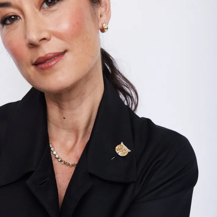 Approximately 0.10ctw rose cut diamonds with 0.70ctw old European cut accent diamonds pavé set in a handcrafted 18K yellow gold owl stick pin.