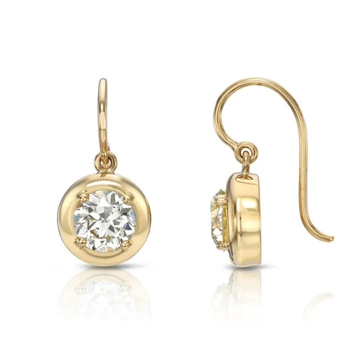 2.13ctw J-M/SI1-SI2 GIA certified old European cut diamonds prong set in handcrafted 18K yellow gold drop earrings.