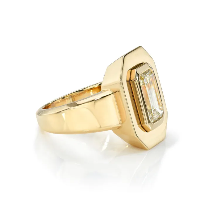 2.39ct W-X/VVS2 GIA certified emerald cut diamond bezel set in a handcrafted 18K yellow gold mounting.