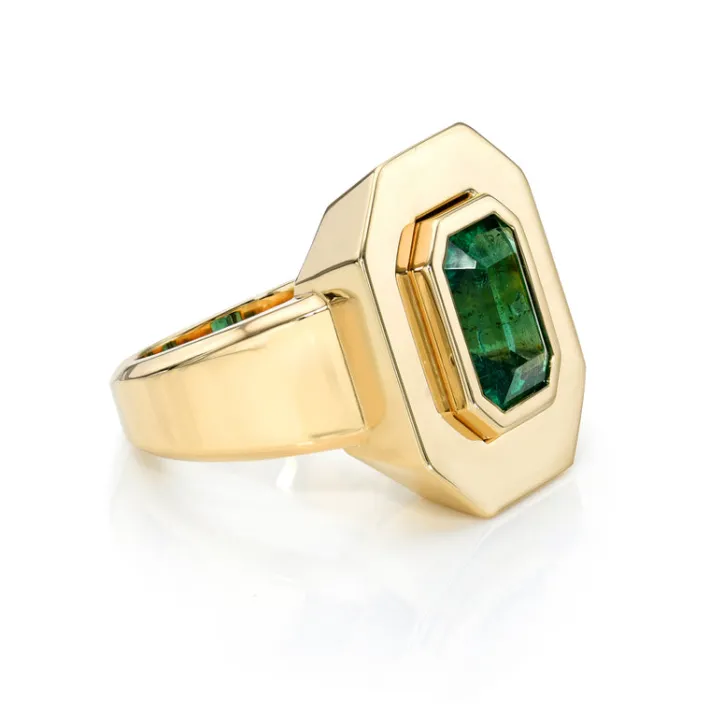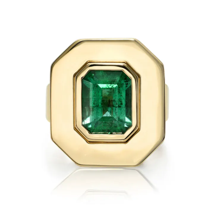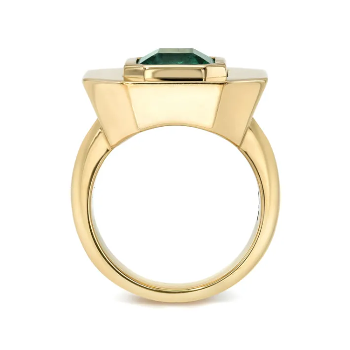 3.14ct GIA certified emerald cut green emerald bezel set in a handcrafted 18K yellow gold mounting.