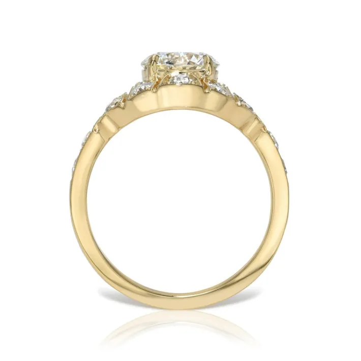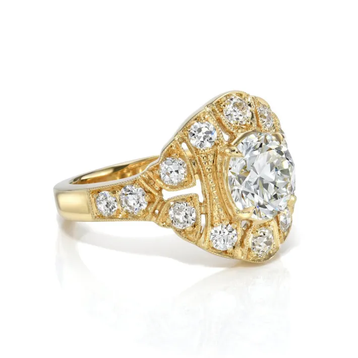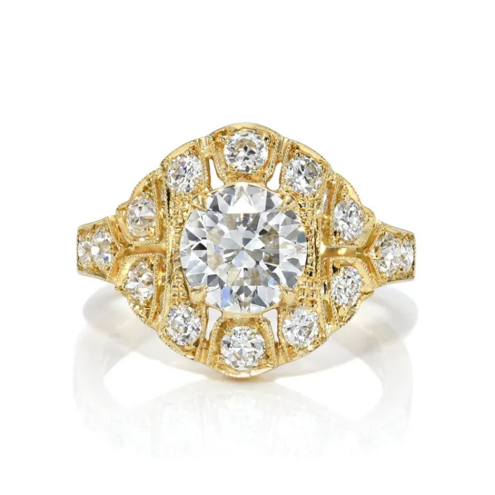 1.33ct H/VS1 GIA certified transitional cut diamond prong set with 0.78ctw old European cut accent diamonds set in a handcrafted 18K yellow gold mounting.