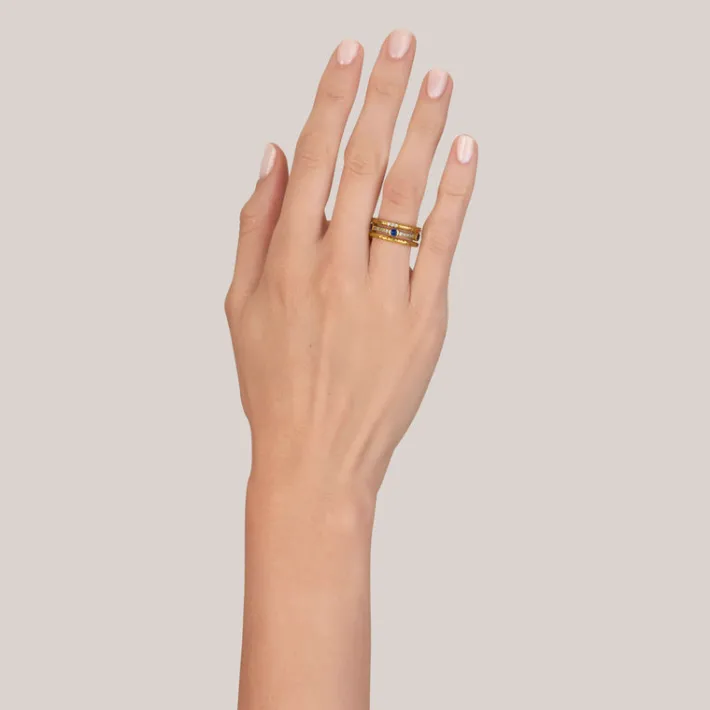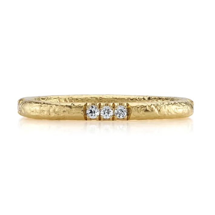 Approximately 0.14ctw G-H/VS old European cut diamonds set in a handcrafted hammered 22K yellow gold band.