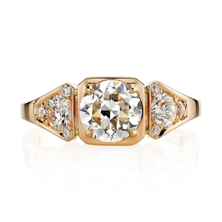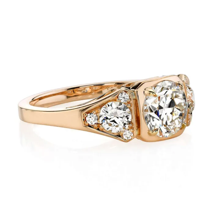 1.05ct G/SI1 GIA certified old European cut diamond with 1.16ctw old European cut accent diamonds set in a handcrafted 18K rose gold mounting.